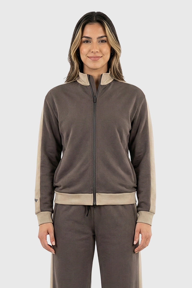 This tracksuit jacket combines comfort with contemporary style, featuring a relaxed loose fit designed for unrestricted movement. Crafted from premium two-tone fabric, this piece delivers both visual interest and superior comfort for everyday wear. The thoughtfully blended materials provide durability while maintaining a soft, breathable feel against the skin. Perfect for active women who refuse to compromise on quality or aesthetics, this tracksuit jacket transitions seamlessly from workout sessions to casual outings. Elevate your activewear collection with a piece that balances performance and sophistication.