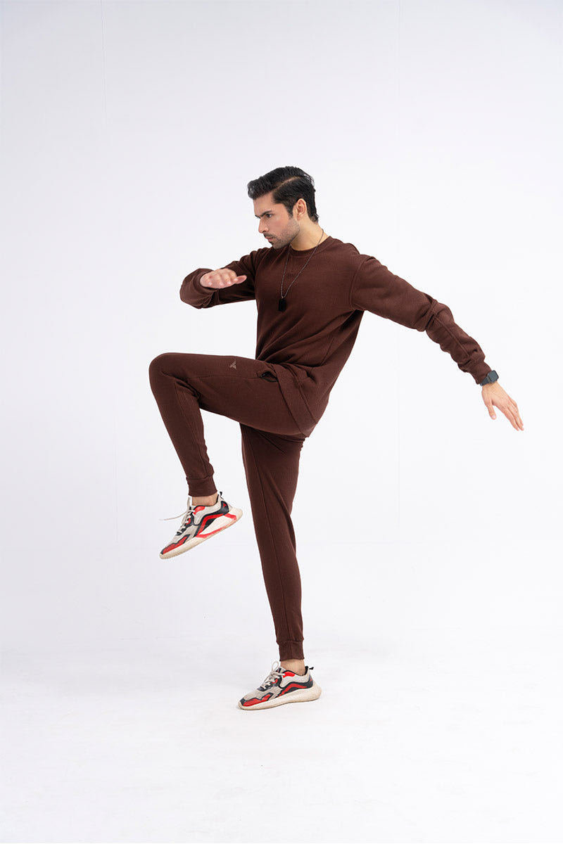 Unwind in the warmth of the EARTH Fleece Sweat Suit in a rich brown hue. This two-piece ensemble is designed for both comfort and style. The cut & sew detailing adds a unique touch to your lounging experience