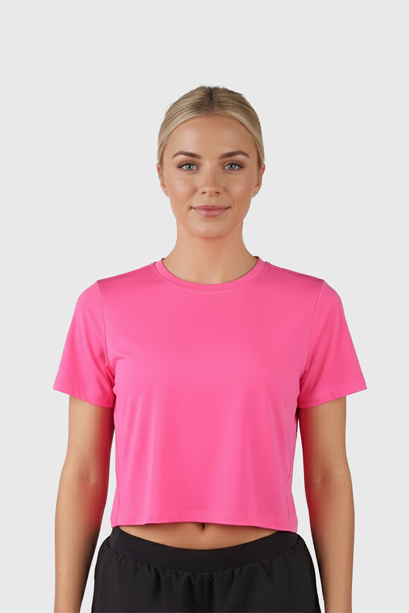 This pink women's crop top combines style with comfort, crafted from breathable fabric that supports active and casual wear alike. Its flattering fit enhances your silhouette, making it an ideal choice for layering or wearing solo during workouts and everyday activities. The vibrant pink shade adds a fresh, energetic touch to your wardrobe essentials.